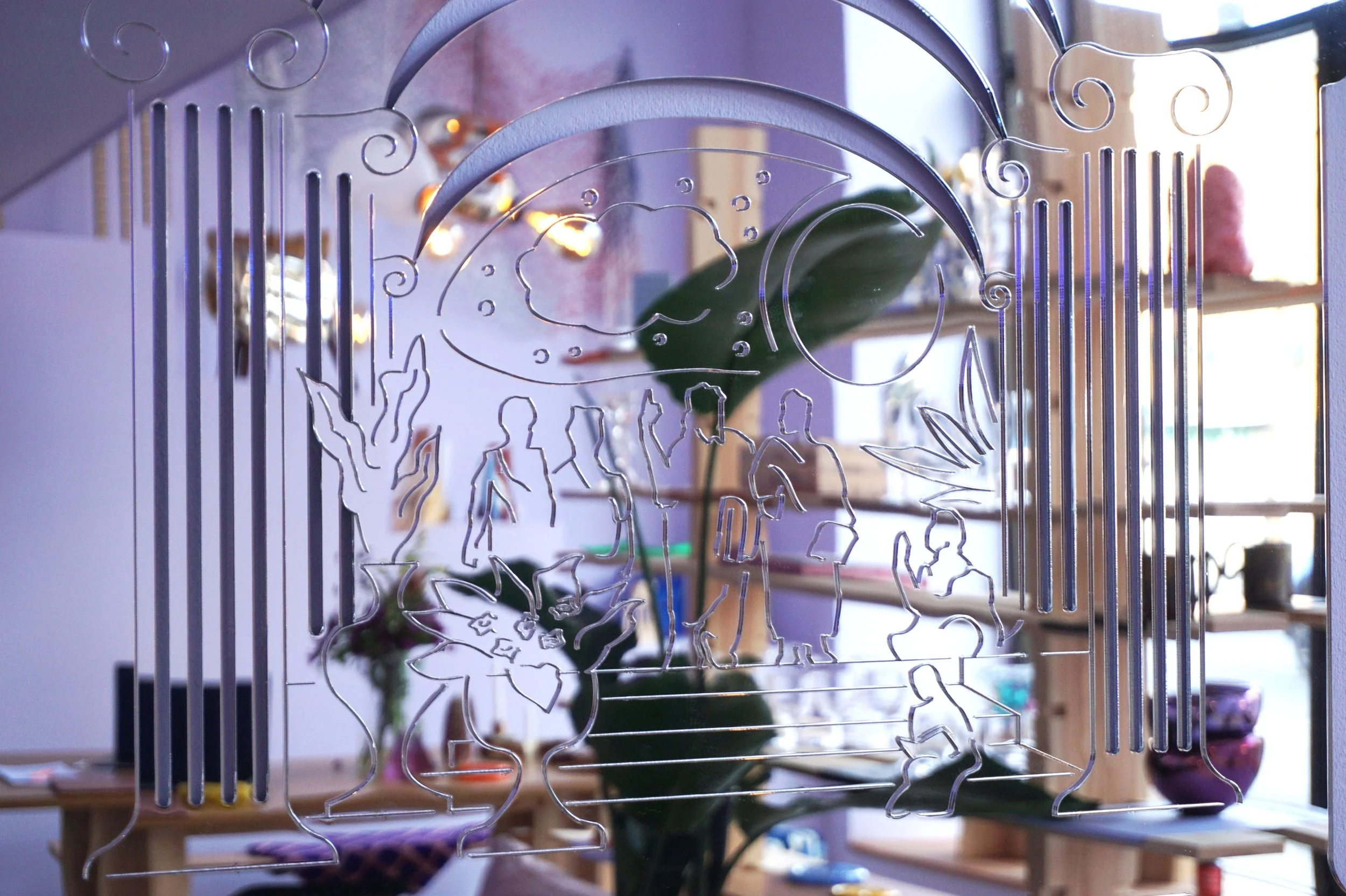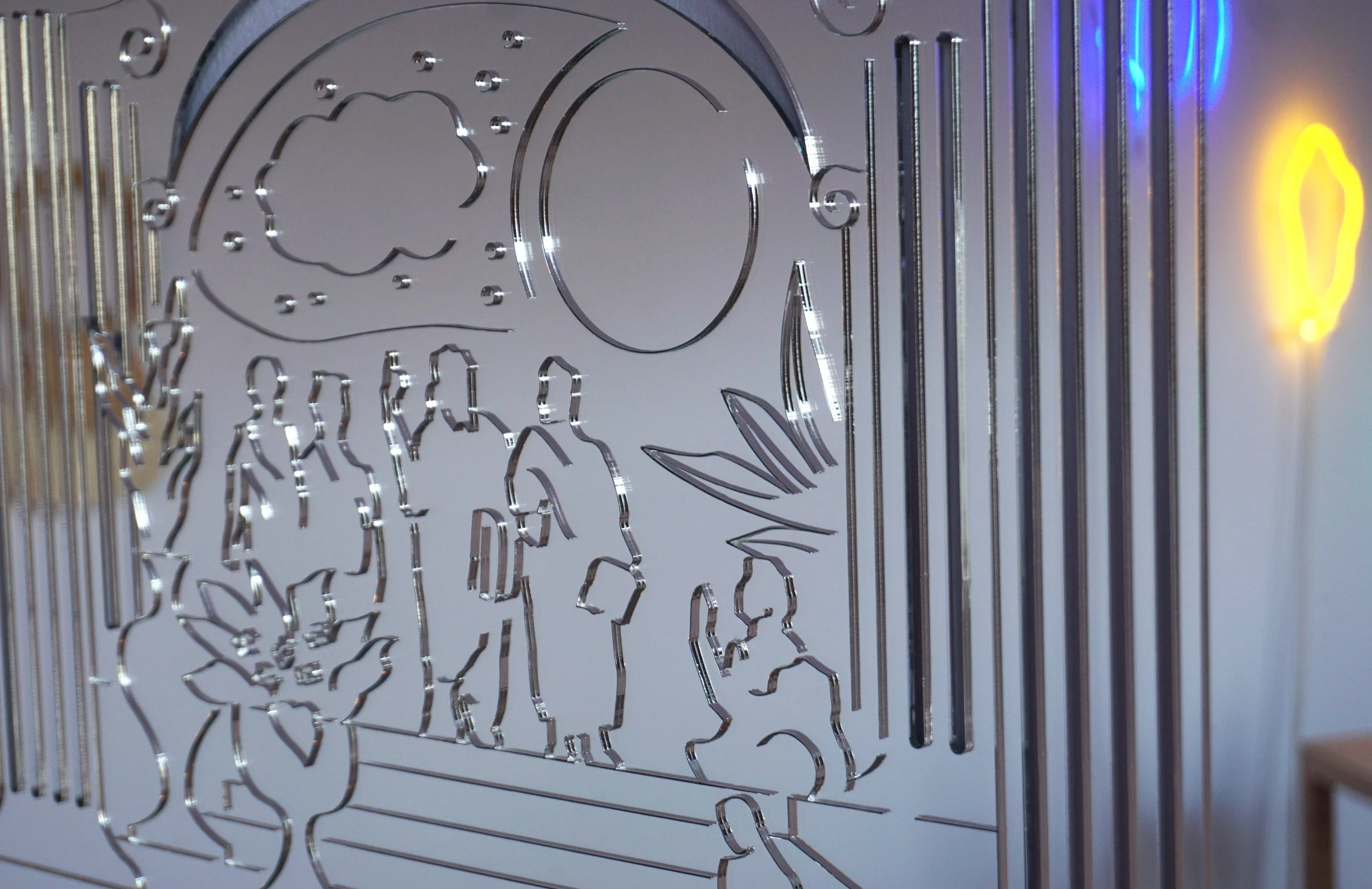 A laser cut mirror paraphrasing the renaissance painting by Rafael with the same name. Where do you draw the line between an object of art and one of design? Is it enough to just add a function to an artifact, or is there another way of deciding where to draw the line? Had this object been something else if it didn’t cast a reflection?